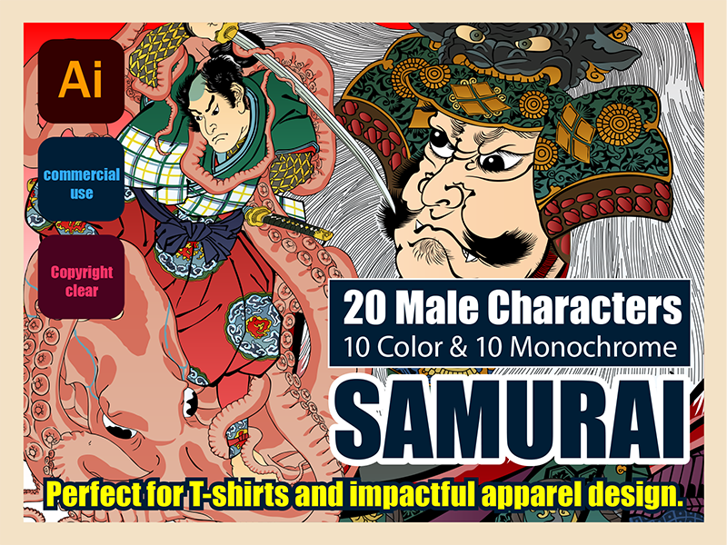 Features 10 full-color and 10 monochrome vectors. Capture the fierce intensity of male Samurai and instantly add a bold Japanese aesthetic to your designs.