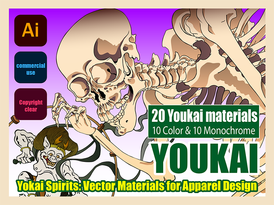 Features 10 full-color and 10 monochrome vectors. Bring the eerie essence of traditional Ukiyo-e Yokai, such as Gashadokuro, to your modern designs.