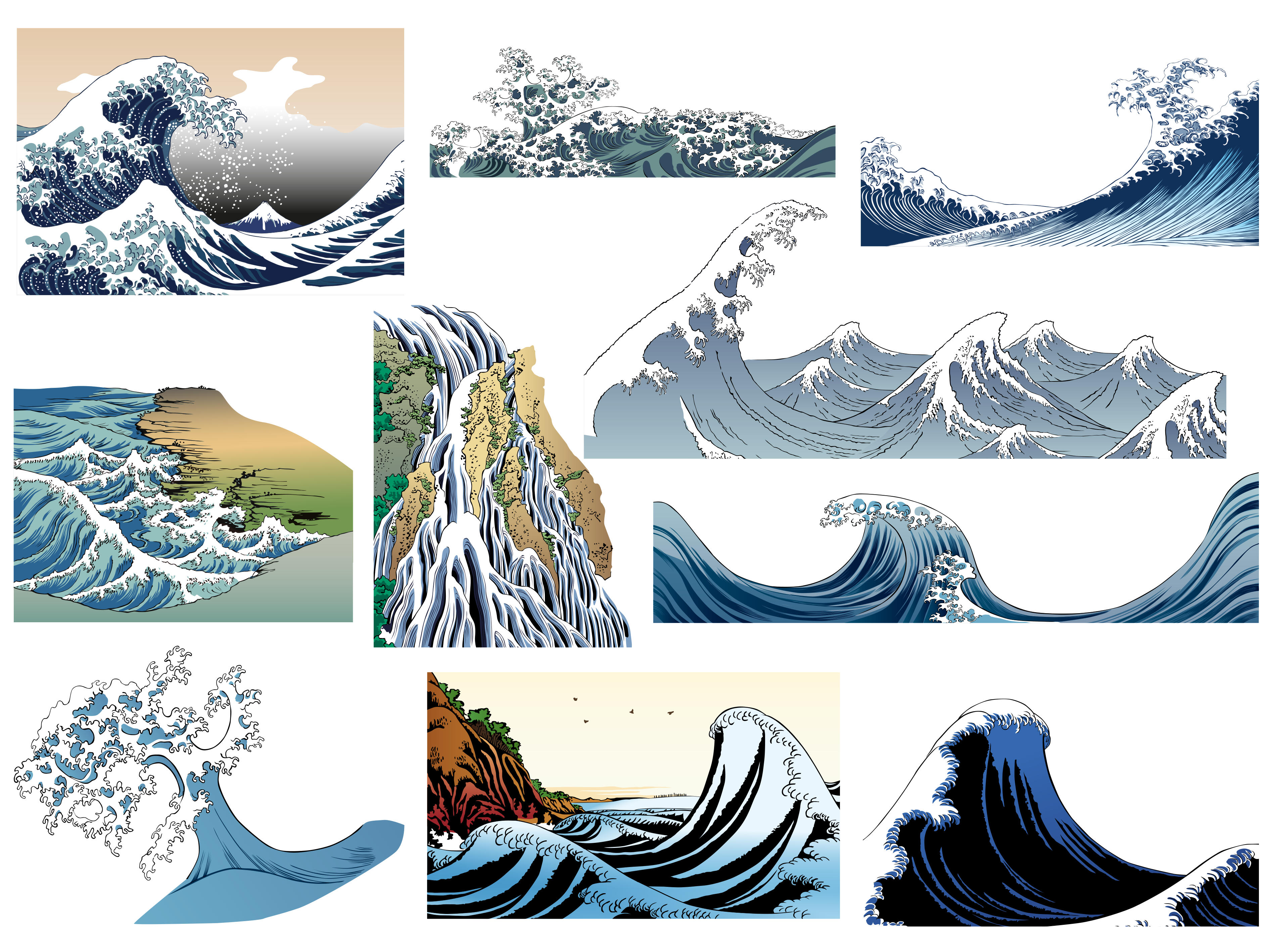 Features 10 full-color and 10 monochrome vectors. Bring the dynamic legacy of traditional Ukiyo-e waves to your modern designs.